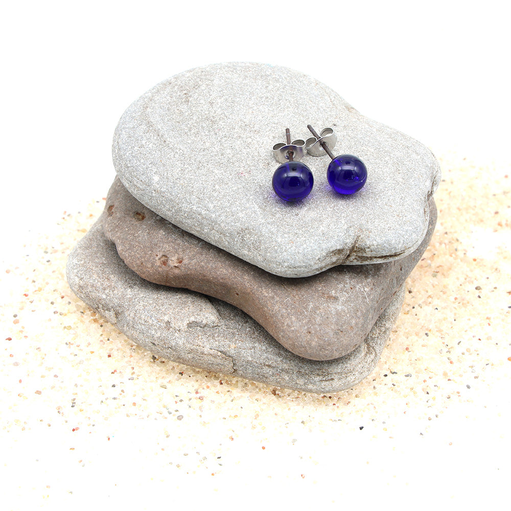 Beautiful little balls of transparent shiny dark blue glass - perfect for catching the light and making your ears sparkle. Mounted on medical grade stainless steel posts, these are earrings you'll love to wear every day.
