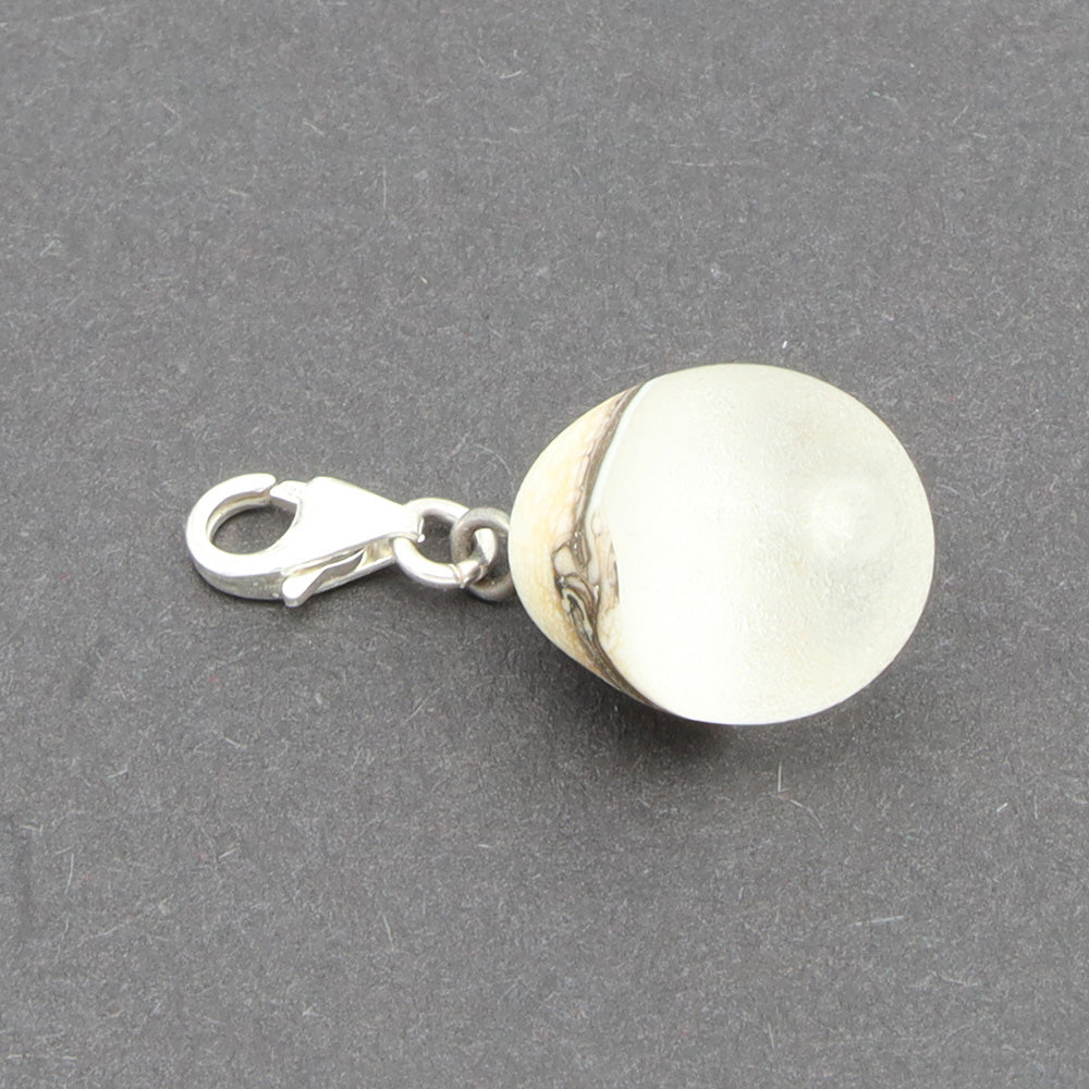We start by making the glass charms on the ends of the stainless steel posts. This fixes the glass securely without the need for drilling or glue. The charms are then annealed to ensure strength and durability. The frosted finish is created by tumbling the charms in a rock tumbler with sand, grit and water. Finally the charms are cleaned, hung on lobster clasps and packed.