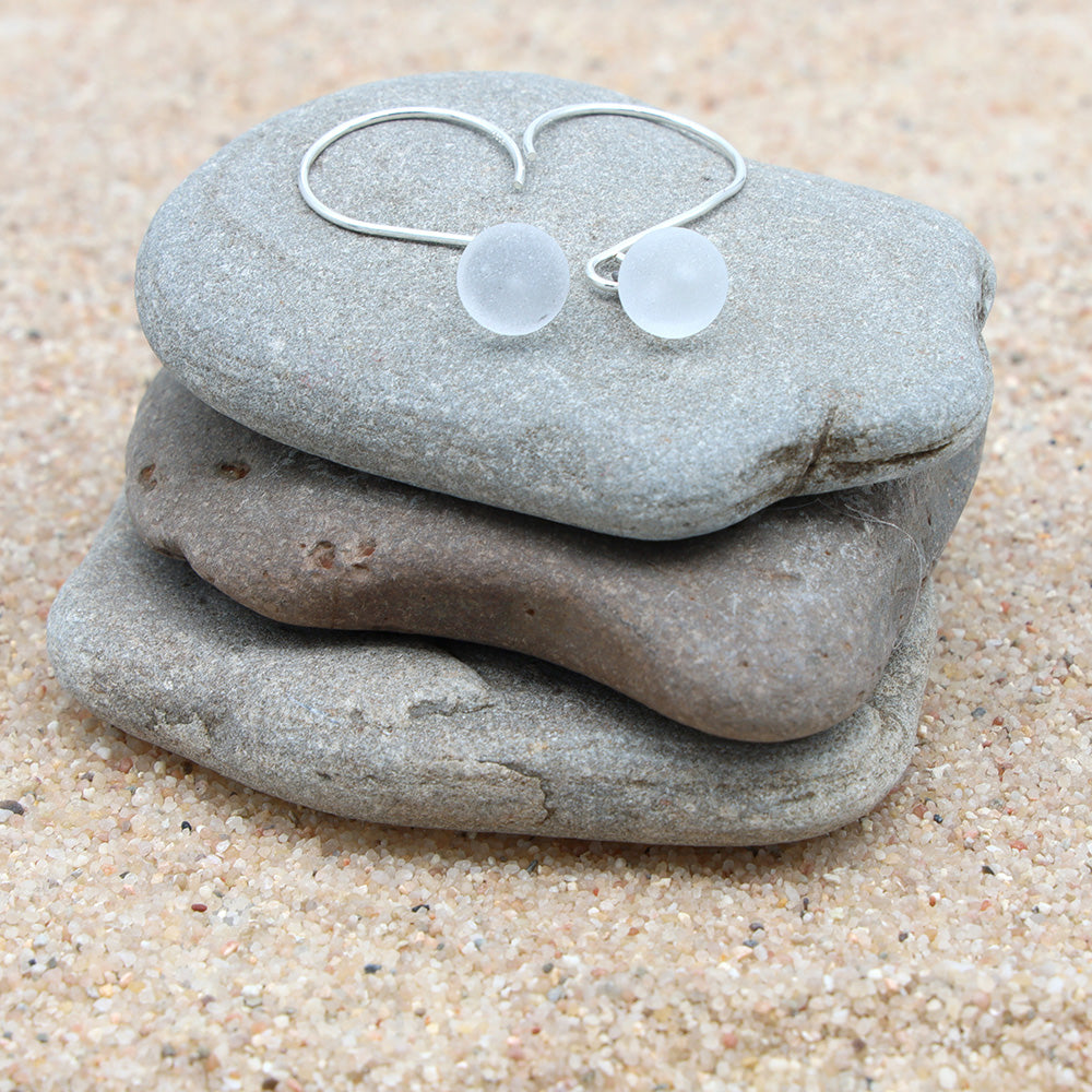 Earrings made with beautiful frosted clear balls of transparent glass which glow as they catch the light. The glass balls hang from sterling silver hoops.
