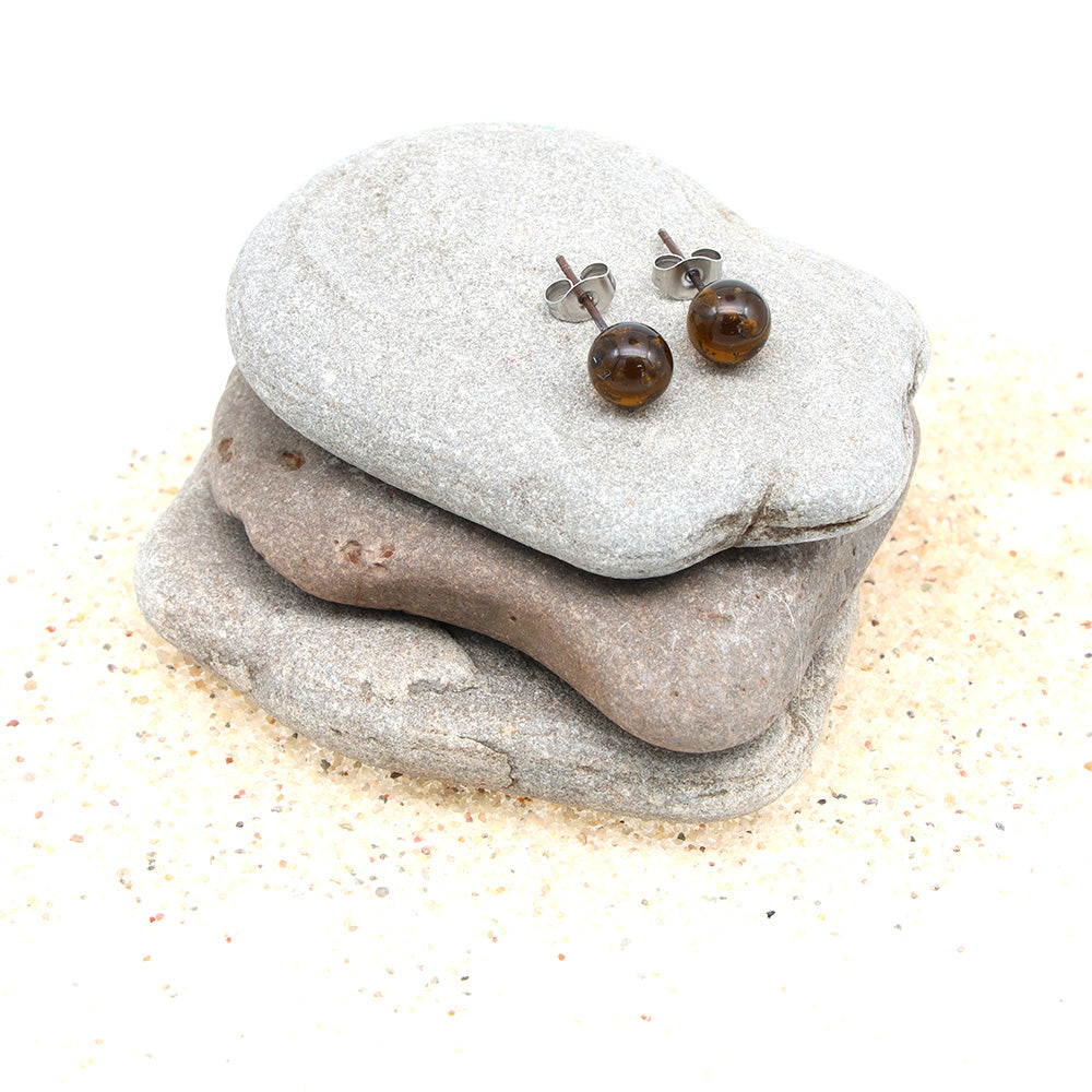 The balls are made from glass from a marmite jar. The earrings are medical grade stainless steel.