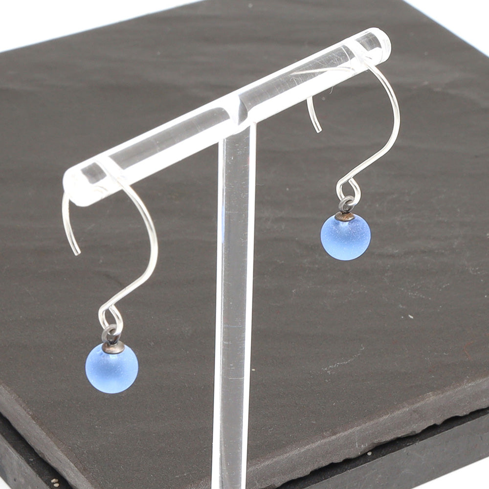 Earrings made with beautiful frosted mid blue balls of transparent glass which glow as they catch the light. The glass balls hang from sterling silver hoops.