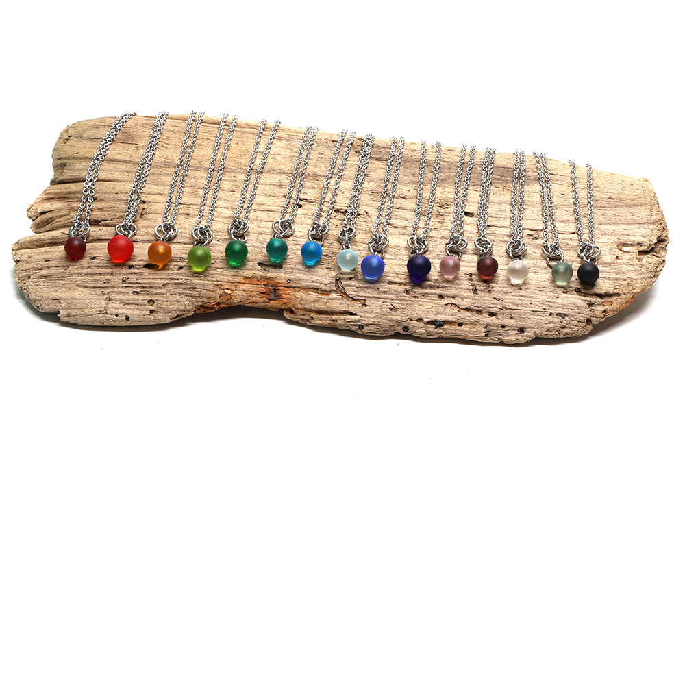 A tiny ball made from clear frosted glass hung from three jump rings and a stainless steel chain making a necklace you'll enjoy wearing every day. Inspired by time spent on the beach, the glass charm has a sea glass like finish.
