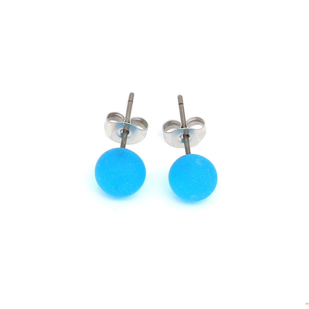 Earrings made with little balls of frosted transparent turquoise glass - perfect for catching the light and making your ears sparkle. Mounted on medical grade stainless steel posts, these are earrings you'll love to wear every day.