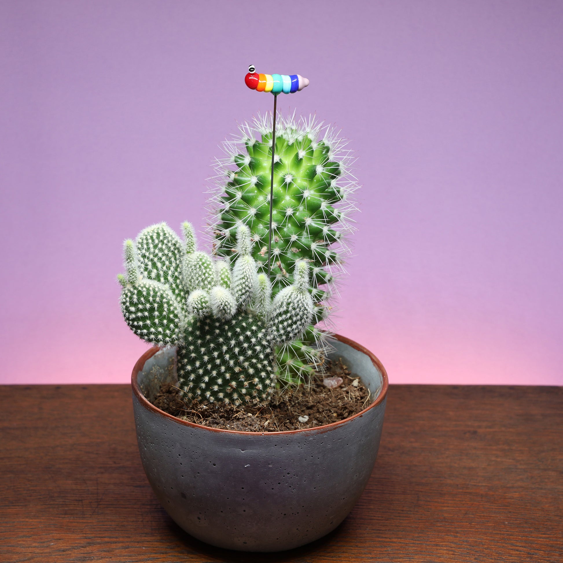 Mounted on a slim stainless steel stake, this caterpillar is easy to add to your plant pots and can stay in place while you water. It’s a fun and colourful addition to foliage plants, fairy gardens, terrariums, or bud vases.