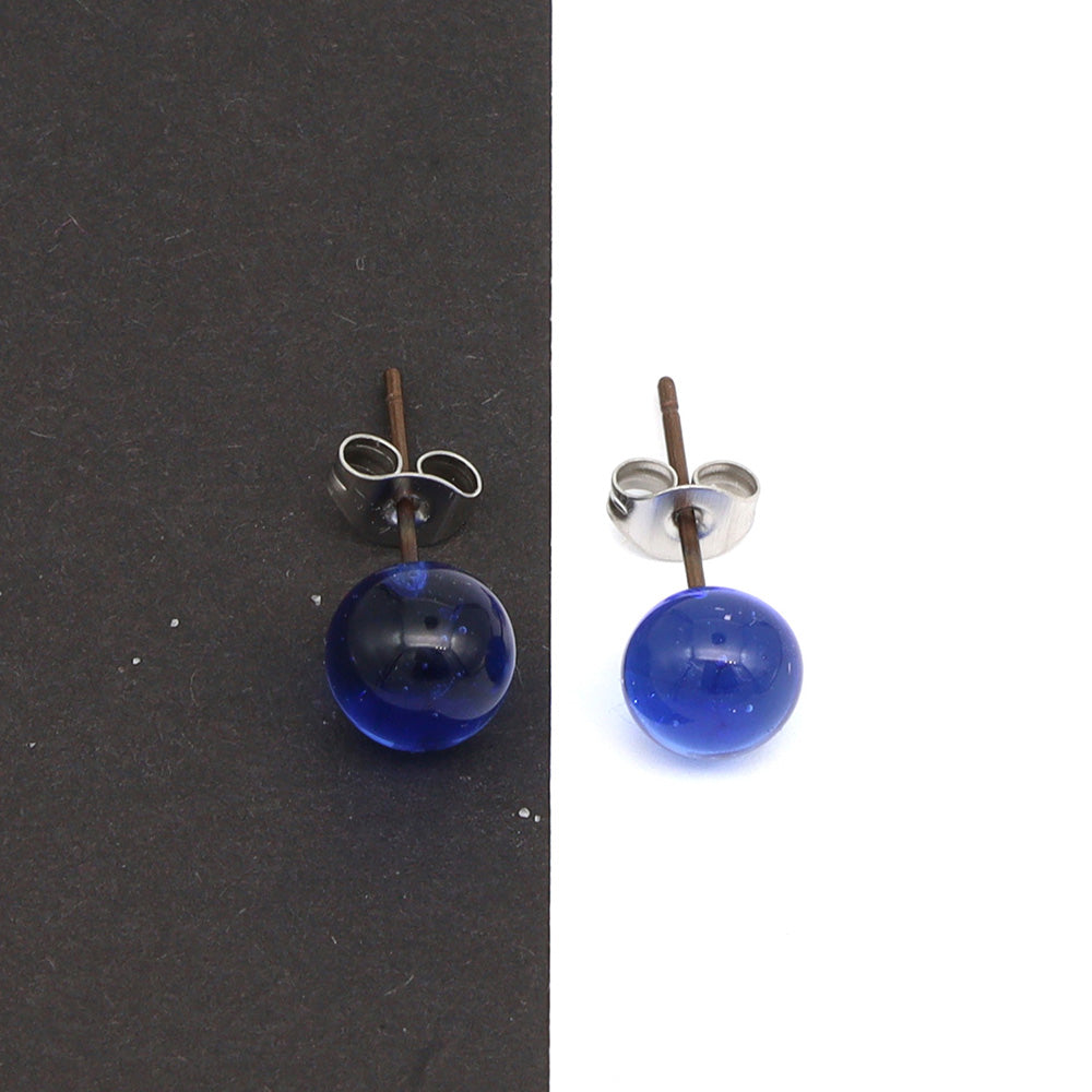 Beautiful little balls of transparent shiny mid blue glass - perfect for catching the light and making your ears sparkle. Mounted on medical grade stainless steel posts, these are earrings you'll love to wear every day.
