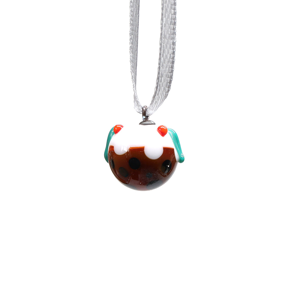 A classic festive treat in glass form. This pud is made from rich brown glass with black dot details, topped with glossy white ‘brandy sauce’ and two teeny sprigs of holly.