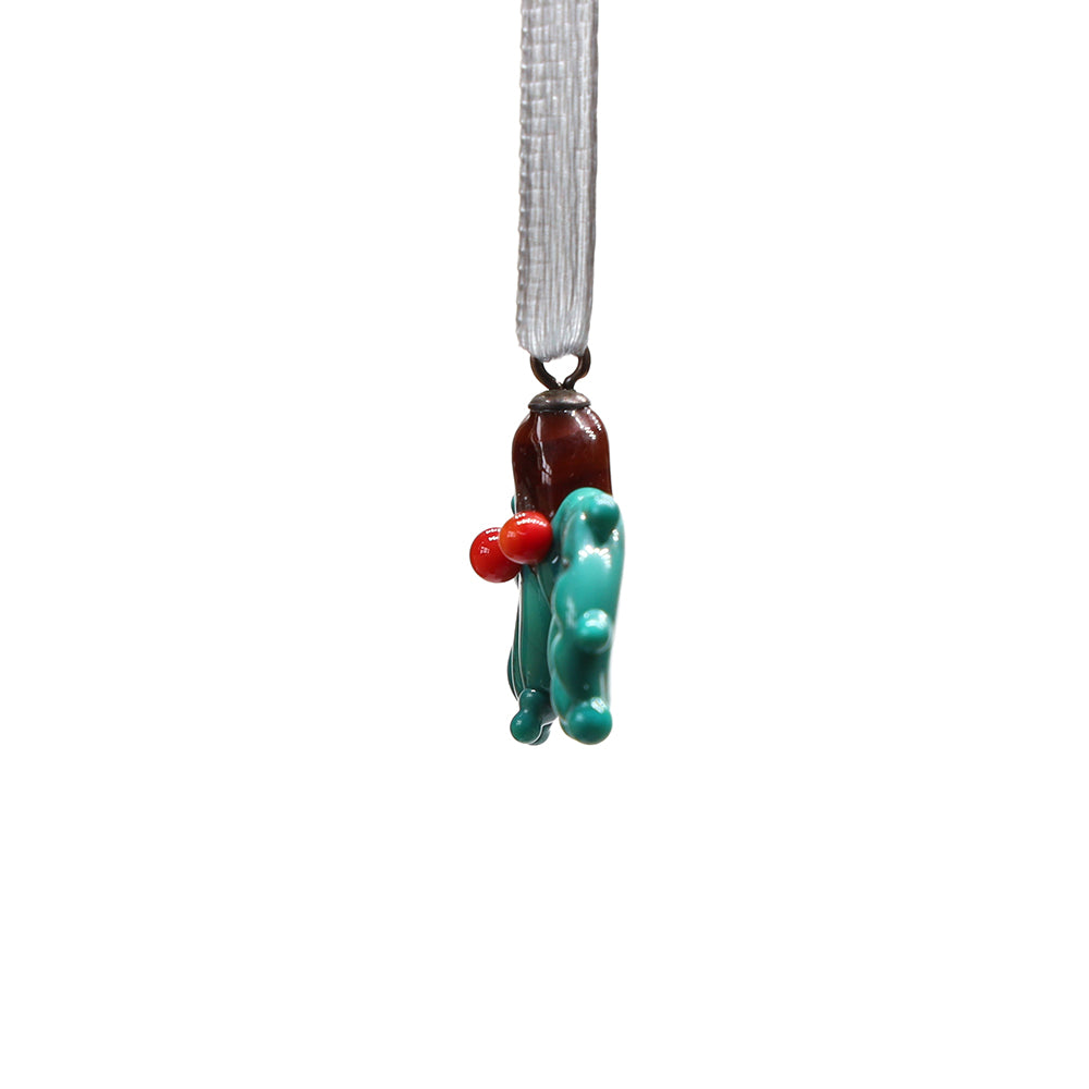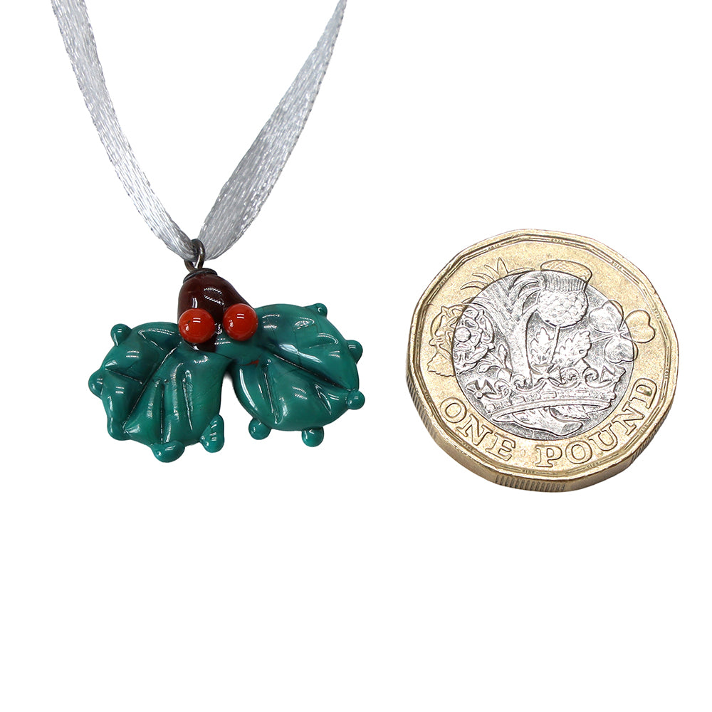 A tiny cluster of festive cheer. Two dark green holly leaves made from glossy glass and three little red berries – simple, elegant, and unmistakably Christmassy.