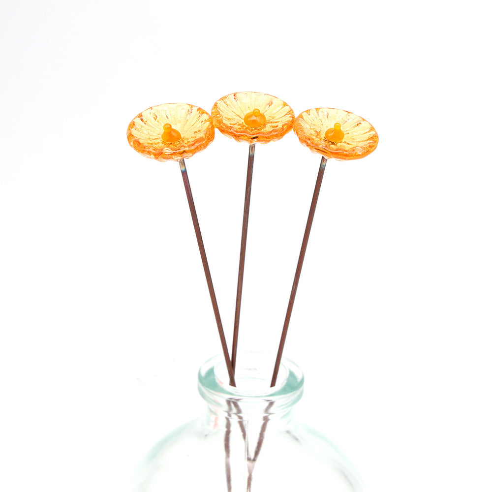 Glass flowers sit on stainless steel stakes which push easily into plant pots and which can be left in place for watering. The flowers are made from transparent glass. For speckled flowers the glass is then rolled in white frit (tiny pieces of glass) to create a speckled effect. Flowers are finished with yellow centres.